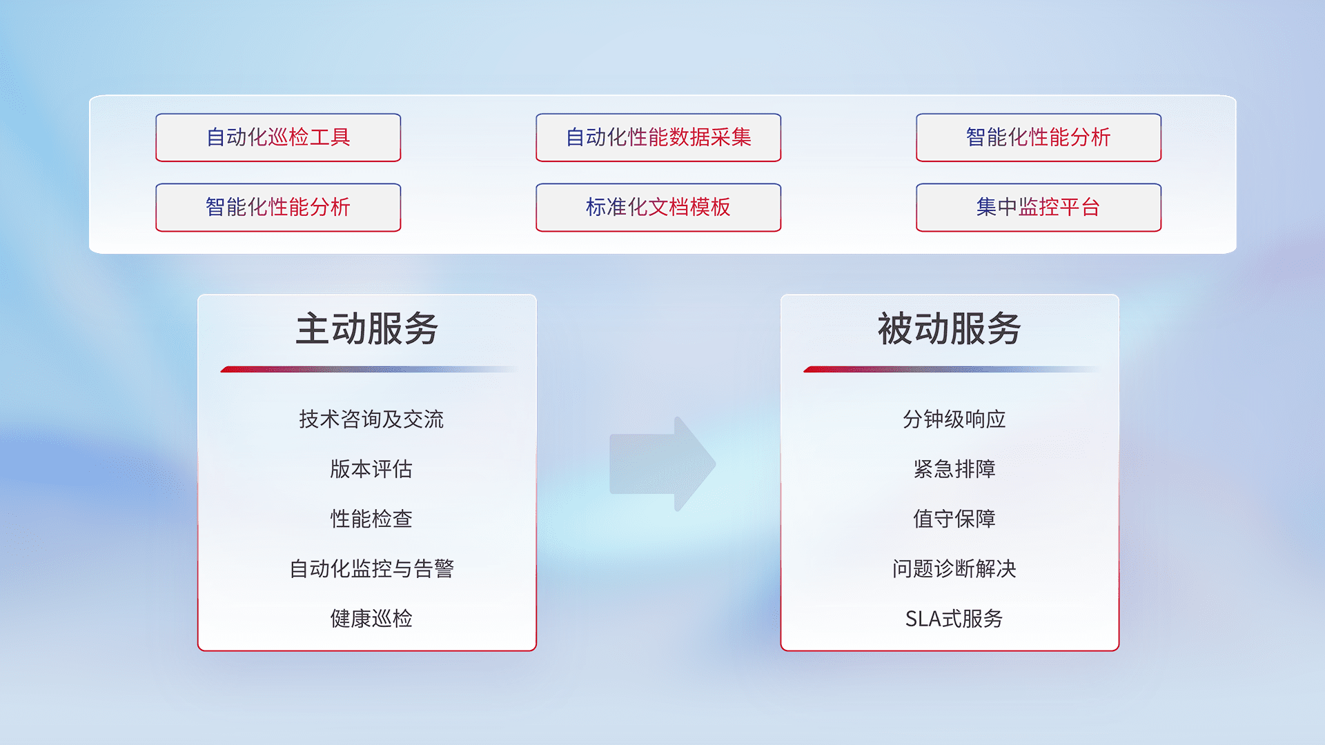 智能化工具和标准化文档,,,,保障服务质量,,,提供主动服务(包含技术咨询、、版本评估、、、性能检查、、自动化监控与告警、、健康巡检)和被动服务包含(分钟级响应、、、、紧急排障、、、值守保障、、、问题诊断解决、、、、SLA服务)。。。